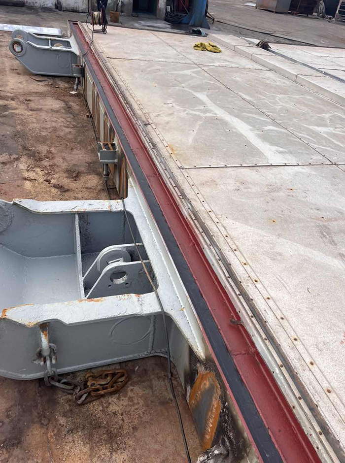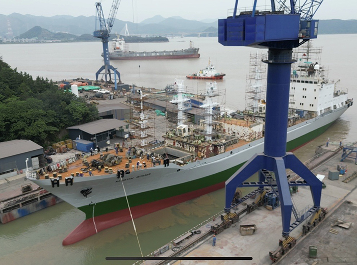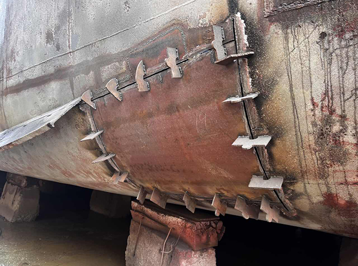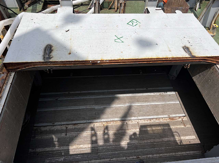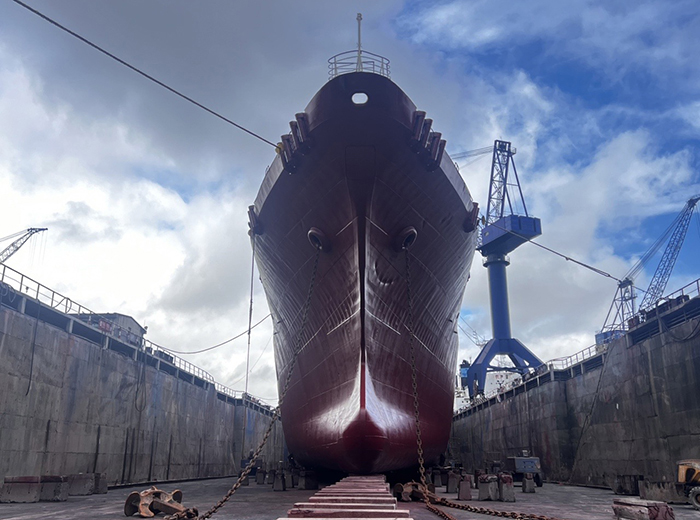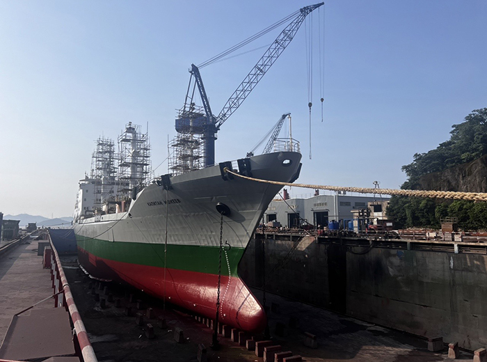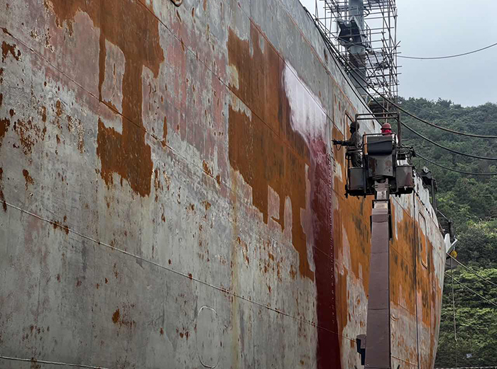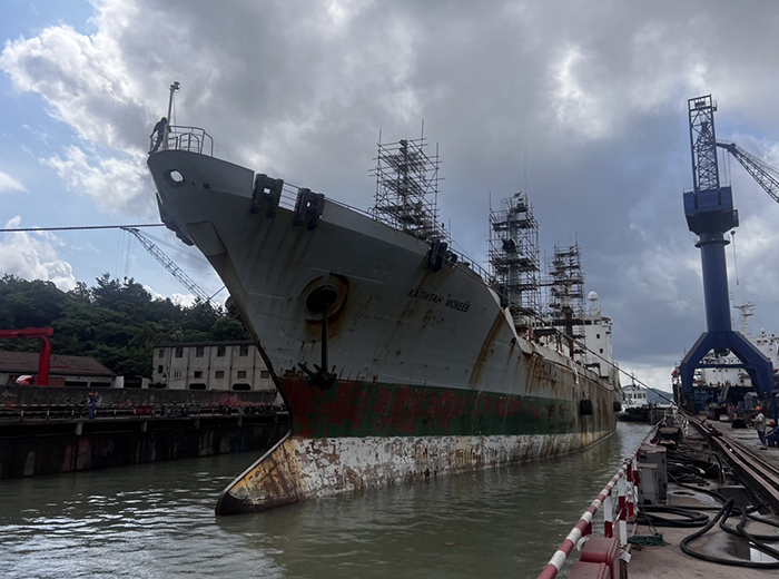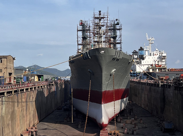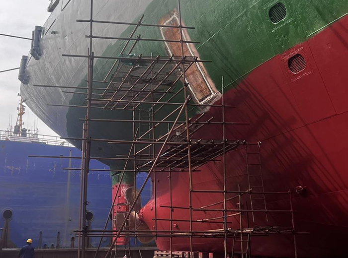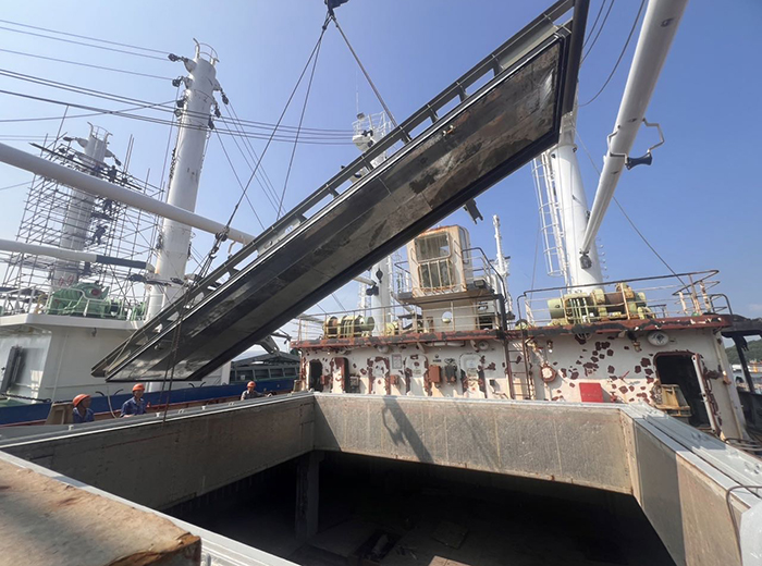 莫科轮于2025年5月28日进册子船厂进行维修,本次修理为中间检验。主要工程有:三、四号货舱换新内底板;二、三号货舱二甲舱盖全部换新(液压缸修理);四套八块主舱盖下地修理;八根吊杆下地修理,尾部生活小吊吊杆下地;锚机下地,齿轮探伤,换新铜套;生活区部分水密门换新;舷梯下地修理;救生艇下地;机舱部分甲板换新;部分起货绞车及电机,千斤索绞车电机,尾部生活小吊绞车下地修理;左舷尾缆机电机修理;机舱部分油柜清洁,蒸汽加热管试压;常规坞修海底舷外阀,管路阀,锅炉阀,压载排水系统气动阀修理;2号停泊海水泵连电机,2号主海水泵,消防泵修理;主机空冷器,主机凸轮轴滑油冷却器修理;23,24号油柜加装连通管路;空压机一台,部分空气瓶瓶头阀修理;生活污水处理系统阀,管路等修理,2个筒体换新,1个齿轮箱壳体换新;坞修换新部分外板和舭龙骨,桨舵组常规测量,探伤;压载舱清洁,装锌块;生活区及全船零碎换板;全船涂装。
