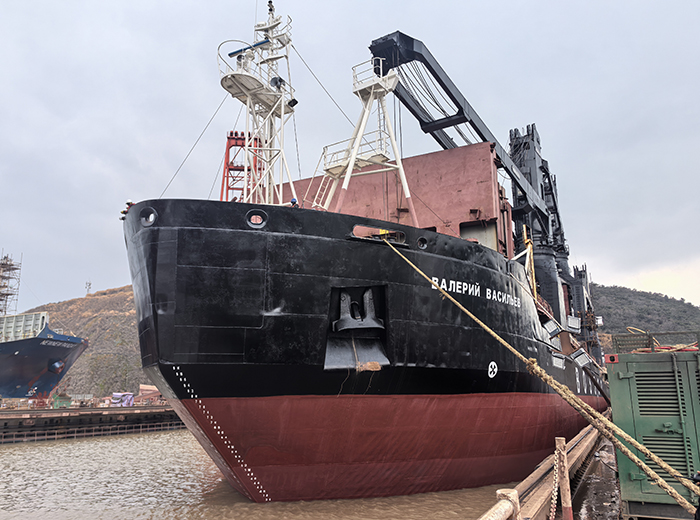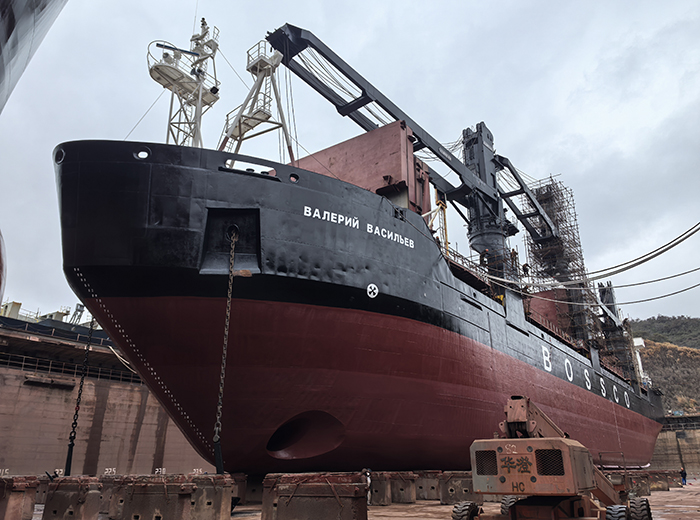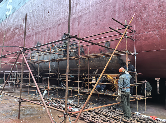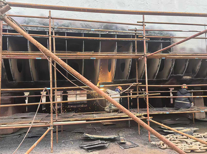 该船本次修理为5年特检,修理地点中天船厂,主要工程有外板换新,焊道补焊,抽尾轴换密封,主机空冷器新制,克令吊保养修理换新油马达等工程。